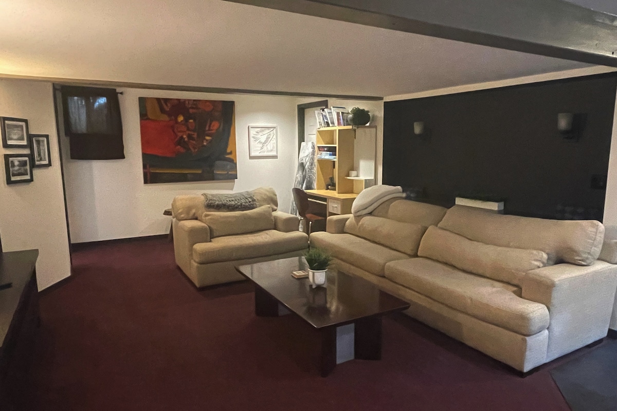 Ce chalet confortable a été conçu et construit avec la location à court terme à l'esprit avec des caractéristiques et des équipements spéciaux que l'on ne trouve généralement pas dans un logement moyen. Votre entrée privée vous accueille dans un espace de 700 pieds carrés que vous pouvez appeler le vôtre avec tout ce dont vous avez besoin pour un séjour relaxant. L'espace est idéal pour 2 personnes, mais peut facilement accueillir jusqu'à 4 personnes. Le plancher chauffant de la salle de bain et le foyer au gaz fournissent de la chaleur pendant les mois les plus frais. Grandes fenêtres pour la lumière du jour et la vue. Donne sur un espace vert. Deux salles de bain.