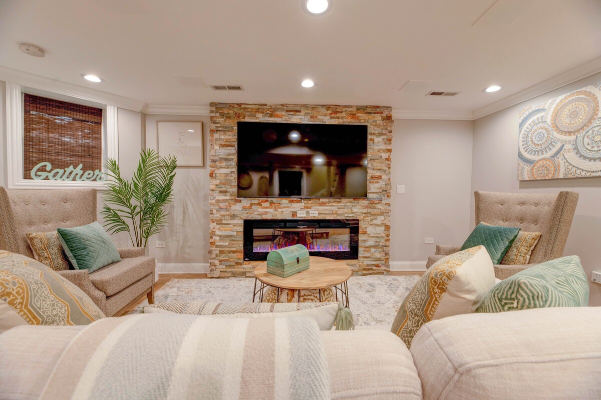 Bienvenue à The Logandale ! Cette maison moderne de 4 lits/3 salles de bain du milieu du siècle est idéale pour les familles, les professionnels et les groupes. Profitez d'un plan d'étage ouvert, d'un patio privé, d'une salle de jeux et de chambres avec matelas à mémoire de forme. La cuisine entièrement équipée, les téléviseurs intelligents avec Netflix et le foyer de la cour arrière assurent un séjour confortable. Situé dans la place branchée Avondale/Logan, vous êtes à proximité des transports en commun, des restaurants et des attractions. Découvrez le meilleur de Chicago avec nous ! 🌃🛏️🎮🔥