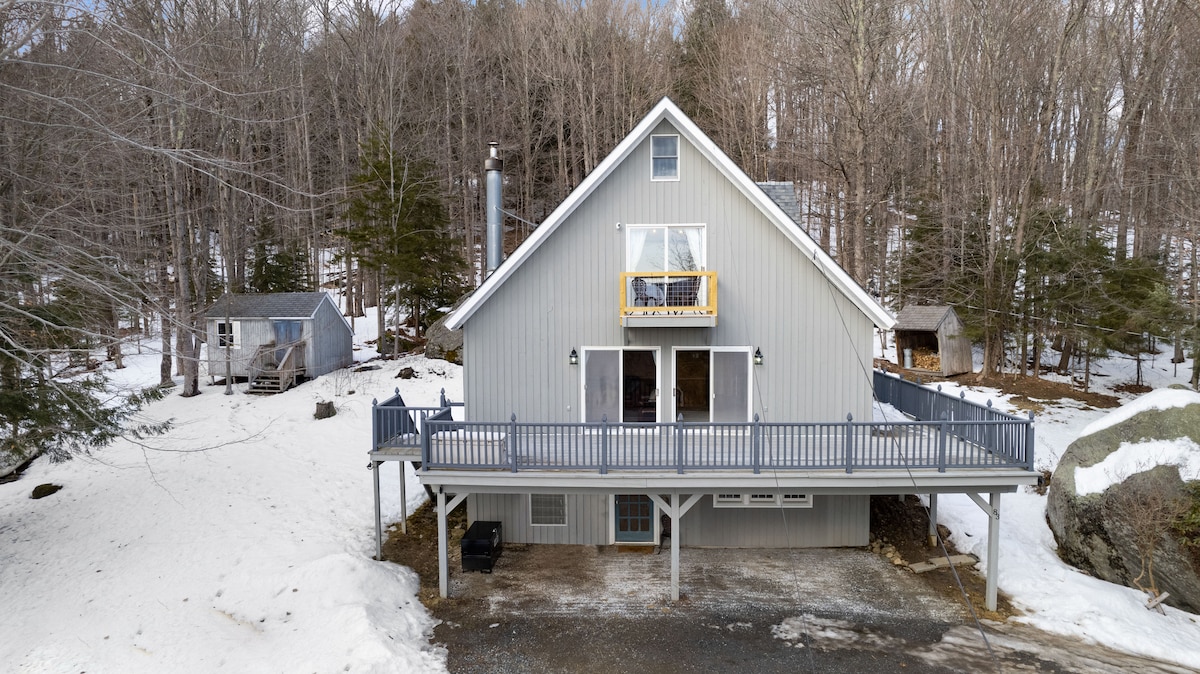 Entourez-vous de nature et confortable et moderne. Le chalet romantique de style mi-mod à 10 acres de forêt paisible, mais est à seulement 12 min en voiture du mont Snow pour un excellent ski. À 3 min de la rampe de mise à l'eau du magnifique lac Whitingham où vous pouvez louer des jetskis et des bateaux ou aller nager et pêcher. Sentiers de randonnée jusqu'à la charmante ville de Wilmington avec ses cafés et restaurants. Piscines et jacuzzi en remontant la route au club house. À quelques pas des sentiers de patinage, de pickleball, de randonnée et de motoneige.