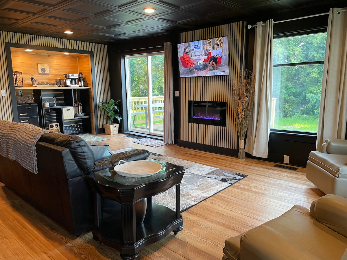 Tout neuf, élégant espace de vie au rez-de-chaussée. 570 pieds carrés d'espace de vie privé. Qualité de complexe hôtelier de charme. La chambre principale dispose d'un lit Queen Sleigh, d'un foyer au gaz (avec contrôle de la température), de 2 fauteuils et d'une kitchenette avec un four à micro-ondes rétro et une cafetière Quisinart K-cup. L'espace de vie connecté dispose d'un grand canapé-lit Queen Size gigogne, d'une télévision UHD de 50", d'une table haute de style pub pour 4 personnes et d'une salle de bain 3/4. Carrelage complexe partout avec tapis de zone. Les animaux ne sont pas acceptés.