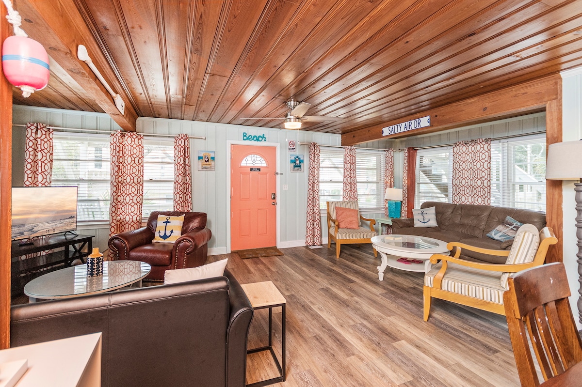 Détendez-vous et profitez de notre confortable Beach Cottage à l'étage au milieu de chênes vivants majestueux. - 100 marches jusqu'à la plage (accès public à la propriété) - Rénovation moderne « plage » (TOUS LES NOUVEAUX APPAREILS/CLIMATISATION/CHAUFFAGE) - NOUVEAU chauffe-eau H2O sans réservoir = eau CHAUDE sans fin pour toute la famille - Animaux acceptés (aucune restriction de race, de taille ou de nombre) Frais pour animaux de compagnie = 95 $ - Cuisine extérieure et barbecue - PARKING GRATUIT - Arrivée transparente avec code d'accès privé - Téléviseur intelligent à écran plat de 75 pouces - Chalet sur un grand terrain double - AUCUN remboursement en raison de la météo