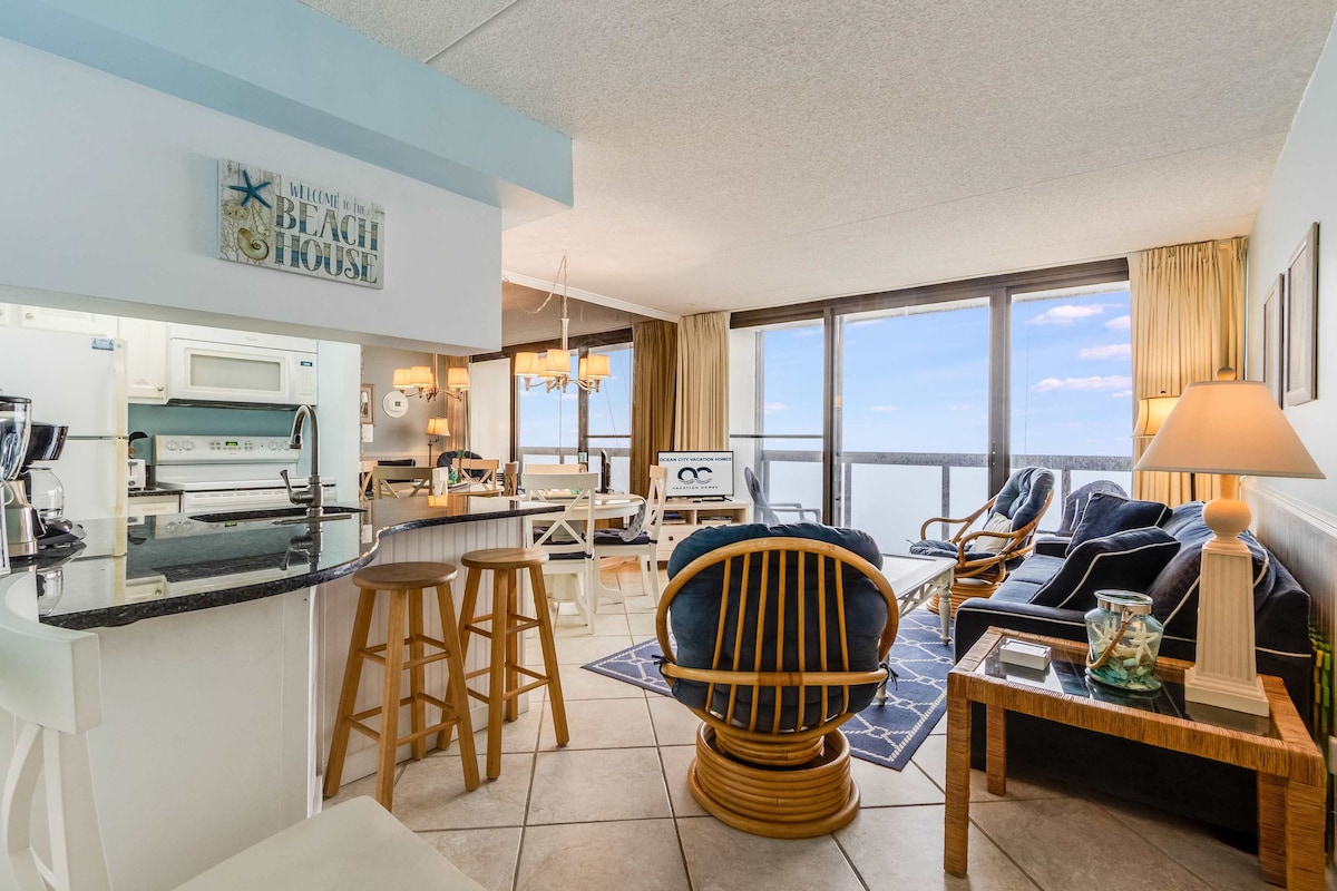 Réveillez-vous avec une vue imprenable sur l'océan à Driftwood, un condo en bord de mer de 2 chambres/1,5 salle de bain magnifiquement rénové dans le Golden Sands Resort riche en commodités! 6 personnes avec 2 lits queen size + canapé-lit queen size. Profitez de votre balcon privé, de piscines intérieures et extérieures, d'une plage privée, d'un centre de remise en forme, de salles de jeux, de tennis, de pickleball, de volleyball, d'une immense terrasse ensoleillée et d'un bar tiki saisonnier. À quelques pas du sable et à proximité de Northside Park, des meilleurs restaurants et de l'emblématique Ocean City Boardwalk!