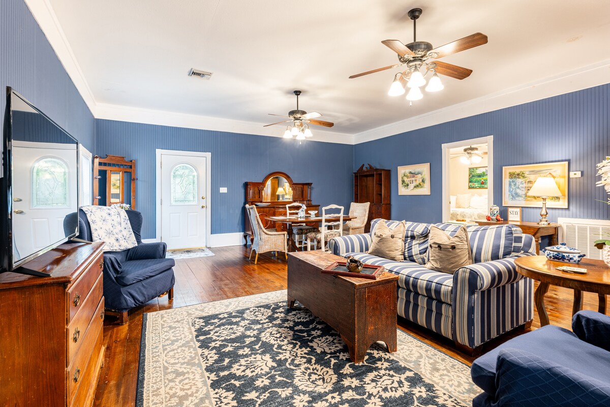 Nous avons une jolie chambre d'amis attachée à notre garage adjacent à notre porche arrière. C'est un petit espace mais il a tout le nécessaire et est super confortable ! Elle dispose d'un lit confortable de grande taille, d'un fauteuil confortable, d'une commode, d'un bureau, d'un petit réfrigérateur, d'un four à micro-ondes, d'une cafetière et d'une télévision à écran plat de 36" avec Amazon Firestick. La salle de bain dispose d'une petite douche. Nous incluons beaucoup de petits extras pour rendre votre séjour agréable. Nous vivons dans le quartier historique du centre-ville de Bastrop. Notre maison a été construite en 1916 par l'arrière-grand-père de mon mari.