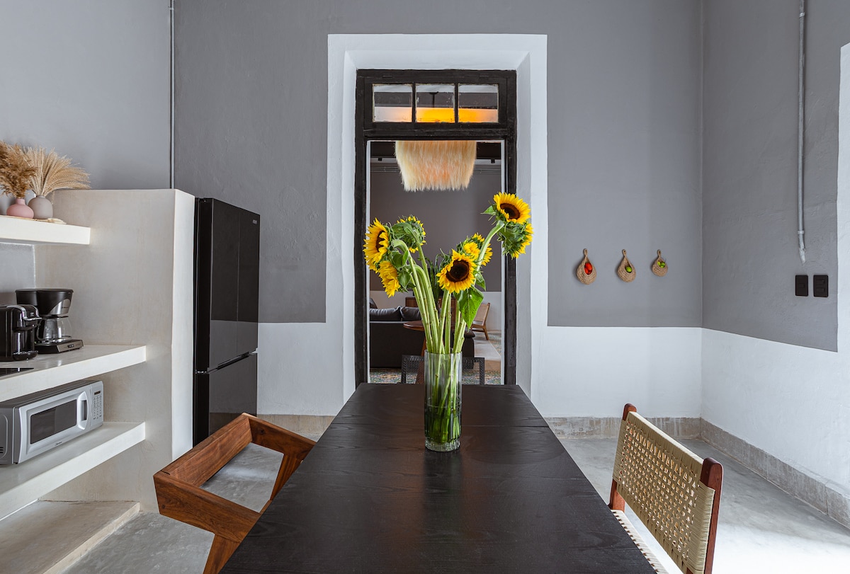 Le point de départ idéal pour explorer le Yucatan ou se détendre dans un cadre magnifique. Située dans une rue calme du centre historique de Merida, la maison peut accueillir jusqu'à 6 personnes dans trois chambres, dispose d'un bureau/salle de télévision séparé pour le travail ou les loisirs, et dispose d'un grand coin cuisine/salon/salle à manger avec beaucoup de lumière naturelle. Vous pourrez vous détendre sous la palapa de la piscine ou dans la cour centrale couverte de vigne, faire un barbecue sur la terrasse sur le toit ou profiter des couchers de soleil depuis le clocher.
