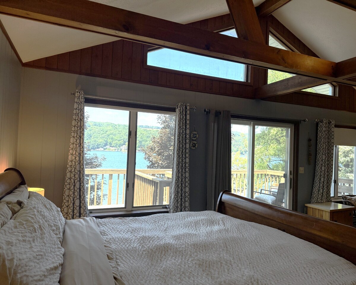 Entièrement rénové en 2022 ! Bord du lac Canandaigua à 5 minutes de Naples, NY ! Bord de lac de plain-pied - Vue imprenable sur South Hill - parfait pour observer les feuilles d'automne et aussi pour nager en été depuis le quai permanent. Avec kayak, jouets gonflables, barbecue au gaz, WiFi, télévision par câble et auvent électrique sur une table de pique-nique. Dégustez des s'mores sur le feu de camp. Décoré avec goût, cuisine bien équipée, lave-linge/sèche-linge et chambre climatisée. Évadez-vous dans les vignobles, à Bristol Mtn. et dans tous les Finger Lakes !