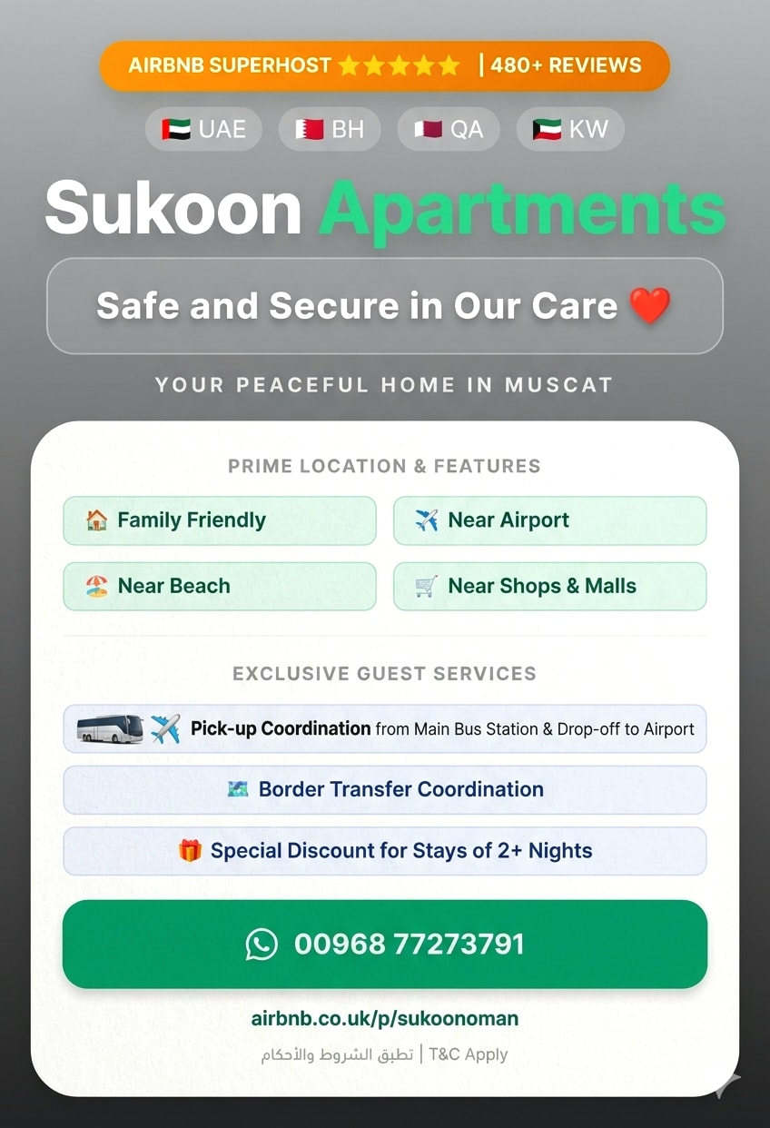 Brand-new apartment in Muscat’s most prestigious seaside neighborhood. Enjoy a peaceful stay just steps from the beach, surrounded by cafés, restaurants, and luxury hotels—at a fraction of the cost. ✔ it is next to Waterfront ✔️Walking distance to the Royal Opera House, W Hotel, and Mandarin Oriental ✔ Beachfront promenade with popular cafés ✔️Walking distance to Jawharati Shatti ✔ Quiet, safe area close to Muscat’s main attractions Perfect for travelers who want location, comfort, and value
