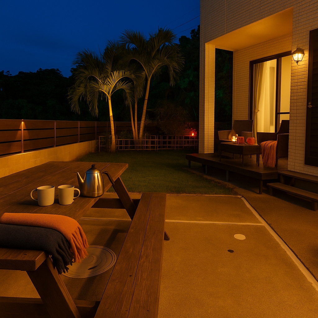 ジャグジー付テラスでBBQを楽しむ!/恩納村一棟貸切/最大8名/ビーチまで徒歩10分/ベッド4台