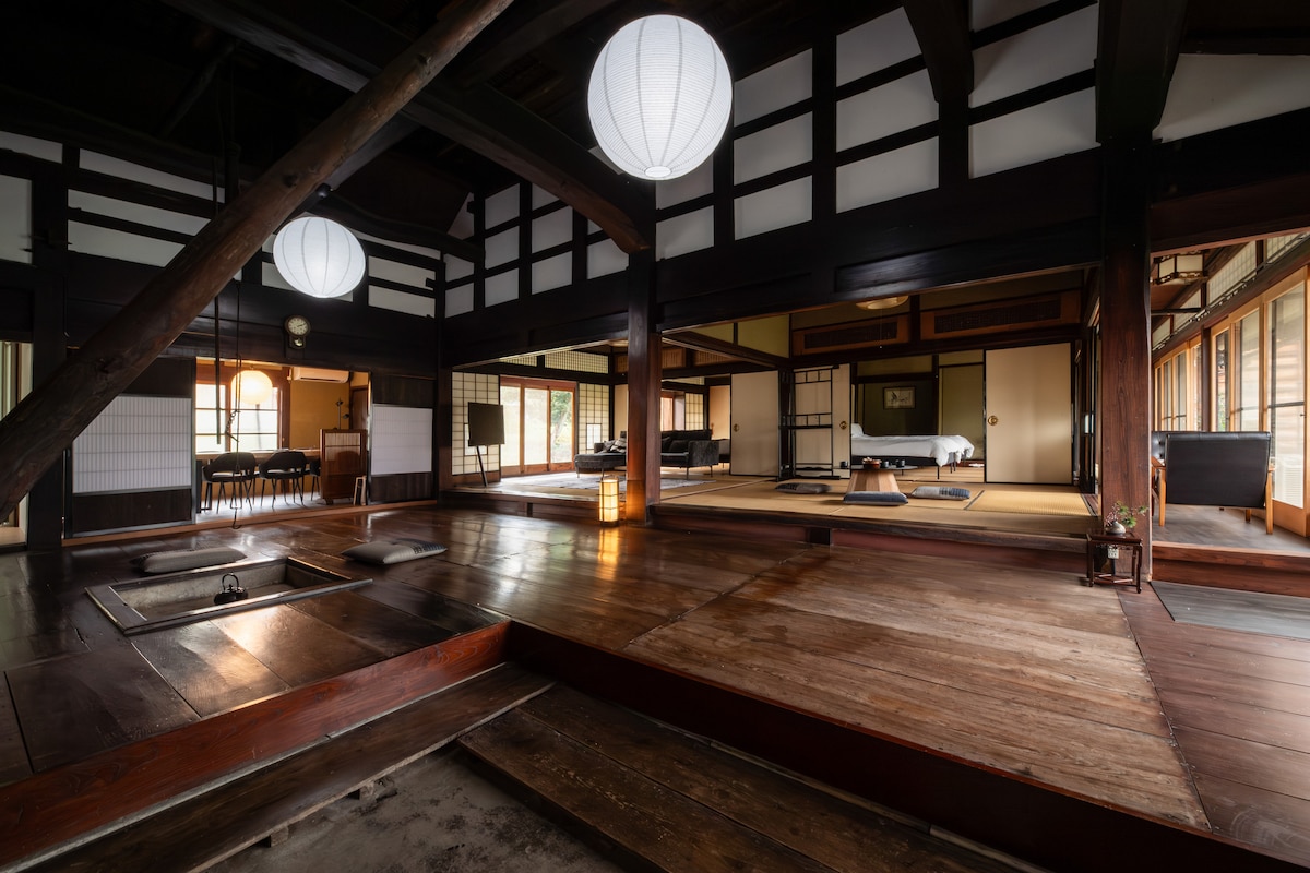 Profitez de la lumière du matin et du calme de la nuit avec le luxe de ne rien faire. Cette maison traditionnelle vieille de 160 ans a été méticuleusement restaurée pour retrouver sa gloire d'antan.Des traces de vie humaine subsistent sur les poutres et les piliers, et le foyer reste tranquillement tel qu'il était à l'époque.L'espace conserve l'atmosphère du bon vieux Japon tout en offrant le confort moderne comme la climatisation et la plomberie. Passer du temps dans cette maison donne l’impression que le temps passe lentement.Pendant la journée, une douce lumière illumine les tatamis, et la nuit, les bruits des insectes et du vent dans le silence sont apaisants.Vivez une expérience nostalgique japonaise tout en discutant avec votre famille et vos amis. Il mesure environ 150 ㎡ et peut accueillir jusqu'à 8 personnes. Un parking gratuit (5 places) est disponible, ce qui le rend idéal pour les voyages de groupe.Notre objectif est d'être une auberge où vous pourrez vous ressourcer, plutôt qu'un simple lieu de séjour. Aperçu de l'installation Louez une maison traditionnelle japonaise vieille de 160 ans.Maximum 8 personnes / 4 lits doubles Espace spacieux de 150 m²Stationnement gratuit disponible (5 voitures) Cuisine équipée (micro-ondes, cuiseur à riz, réfrigérateur, ustensiles de cuisine de base et vaisselle)Salle de bains et toilettes : Caractéristiques modernes (avec WC à bidet)Wi-Fi, climatisation et sèche-cheveux disponibles.La cheminée est installée à des fins ornementales (le feu ne peut être utilisé)