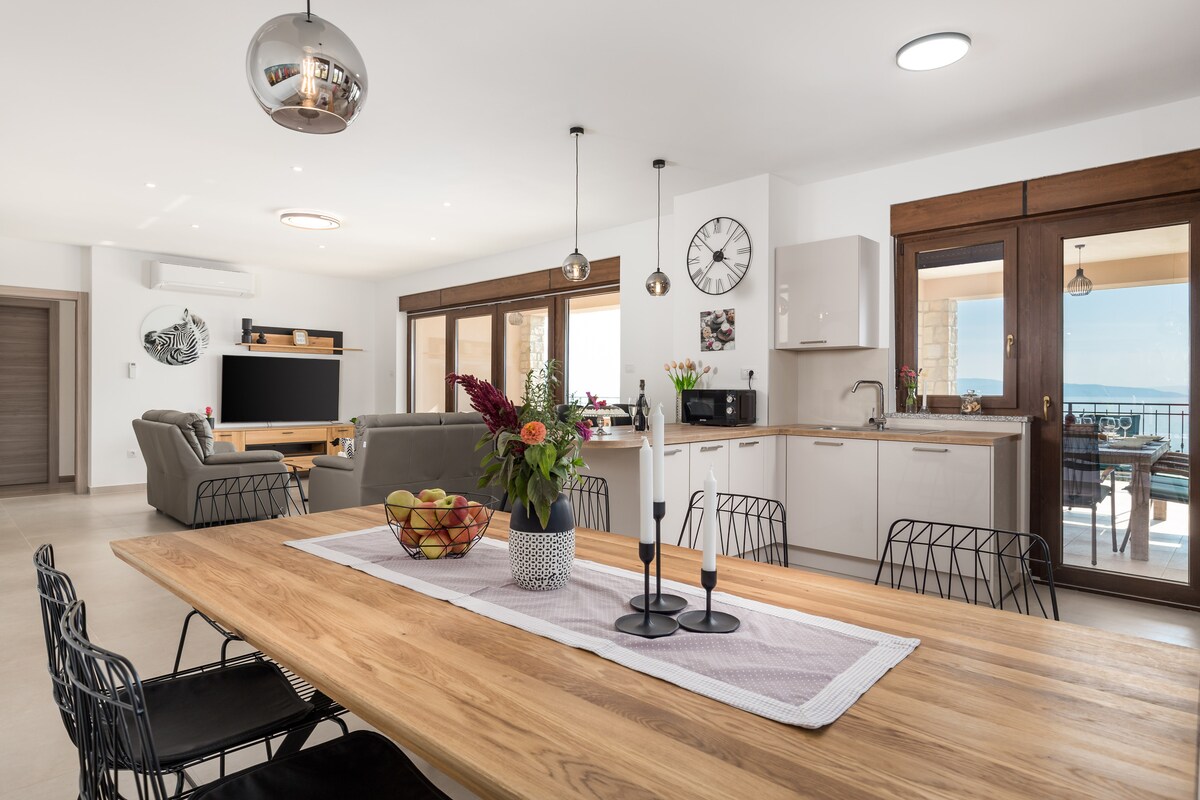 Appartement baigné de lumière (loft) dans une villa avec une vue magnifique sur la mer et les montagnes au-delà. Appartement de 65 m2 avec une terrasse sur le toit qui offre une vue à 250 degrés. À 300 mètres à vol d'oiseau et à 5 minutes à pied de la mer par un escalier. Quartier résidentiel très calme. Place de parking gratuite. La forêt avec des sentiers pour la marche et la randonnée est juste derrière la maison. Vie saine car des matériaux de construction écologiques ont été utilisés. Refroidissement par le sol, pas de climatisation.