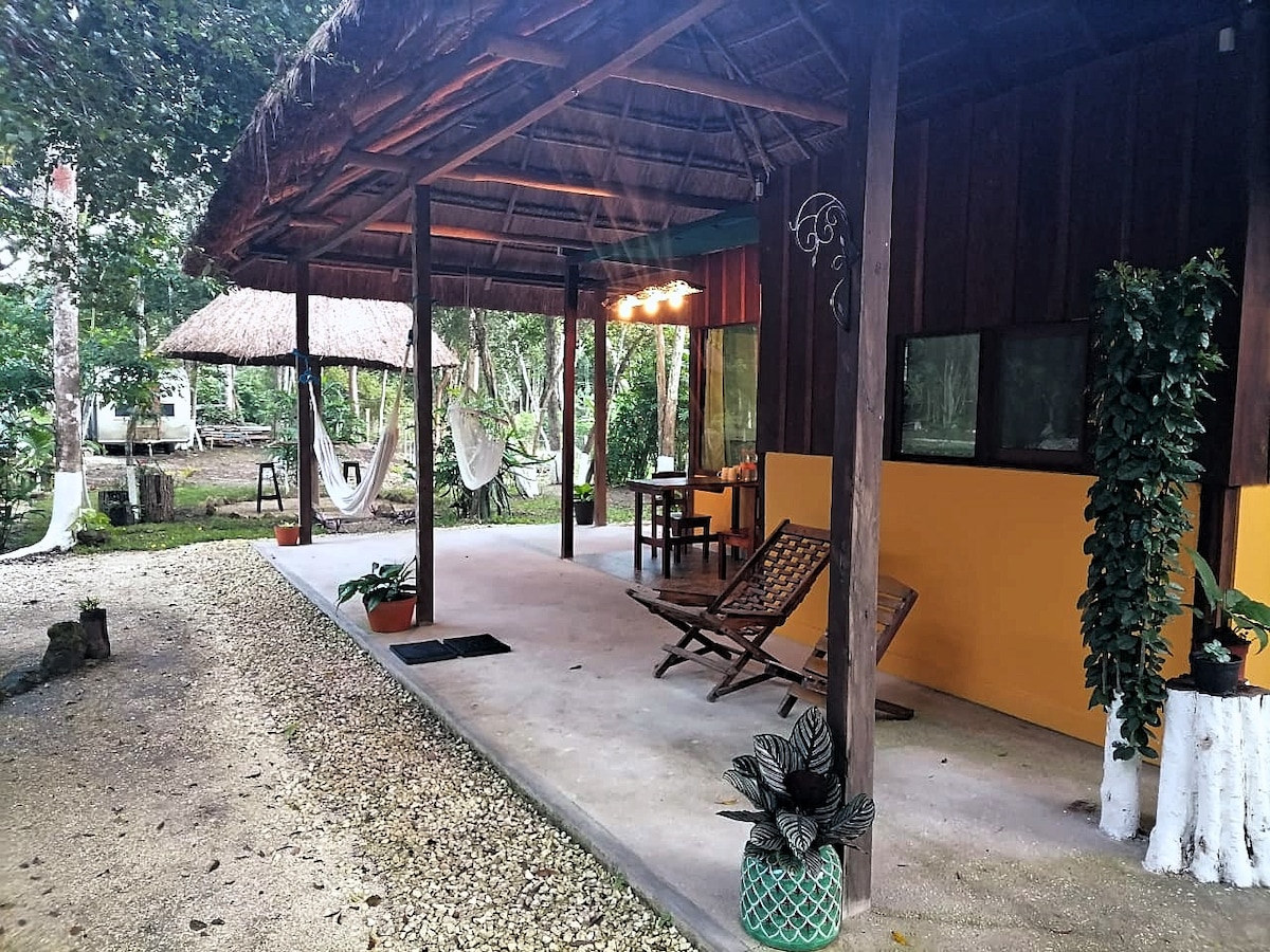 Détendez-vous en famille dans cette cabane paisible de l'Eco Aldea Kinich Ahau, dans la jungle près de Xpujil, Campeche avec plusieurs sites archéologiques mayas à proximité. Jeux de société et cuisine à l'intérieur, feu de camp et à proximité "Sendero del Mono" (Monkey Trail) à l'extérieur. Depuis le balcon du deuxième étage, vous pouvez voir le sommet de la pyramide de Xpujil pendant la journée et des multitudes d'étoiles la nuit.