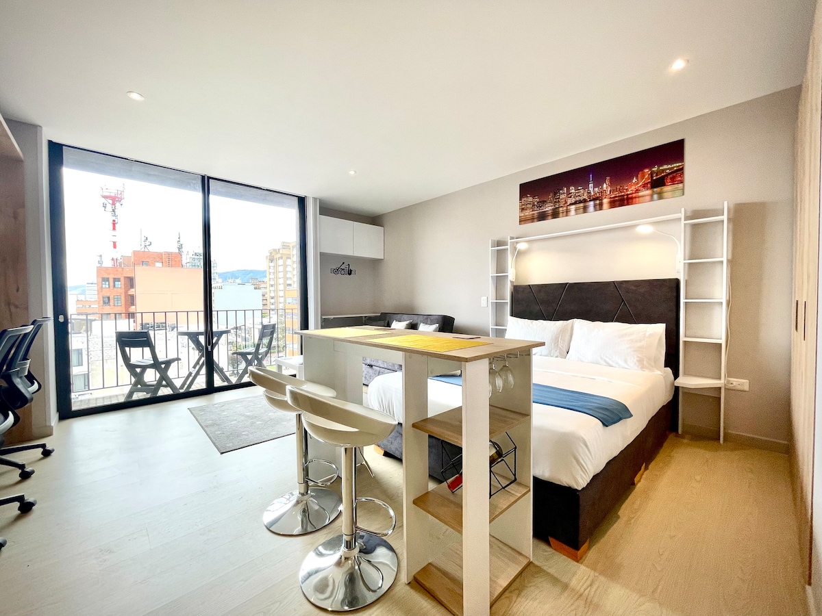 Apartaestudio con terraza nuevo amoblado y equipado, chapa inteligente para mayor seguridad, vigilancia 24 horas, televisión con plataformas de stream y canales, Wifi; Ubicado en Chapinero, zona estratégica en la ciudad de Bogotá, donde encontrarás cerca, centros comerciales, los mejores restaurantes y bares de la ciudad Recomendación: Al momento de realizar tu reserva se pedirá foto del documento de identidad para realizar la autorización de ingreso al edificio, como lo exige la administración.